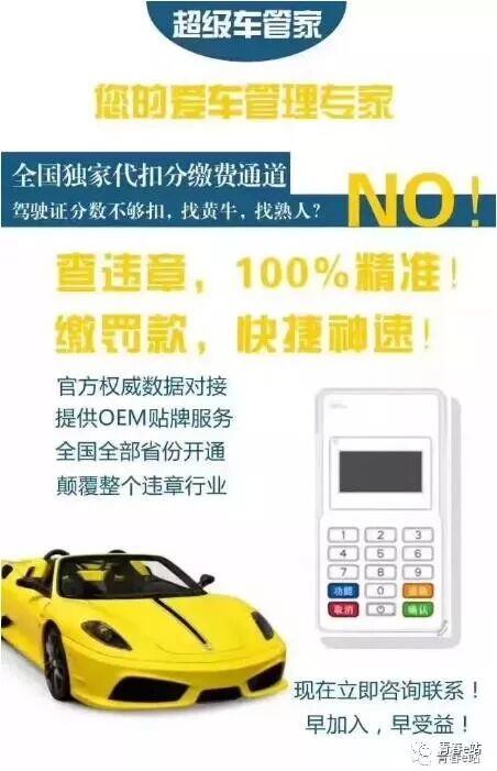产品介绍:轻轻松松处理您的和朋友的违章! 全国独家代扣分缴费通道,全国全部省份开通,无死角,违章数据100%精准,违章处理上线优化速度,更快,更准,更狠!颠覆整个违章行业,早开发,早收益。 【超级车管家】全国首发: 诚招代理:互联网+处理汽车违章,机器配套APP内教程,输入行驶证信息,查询违章记录,扣分记录,点击提交订单,机器上刷卡支付,等待代扣分(无论多少分,包括12分)统统处理!